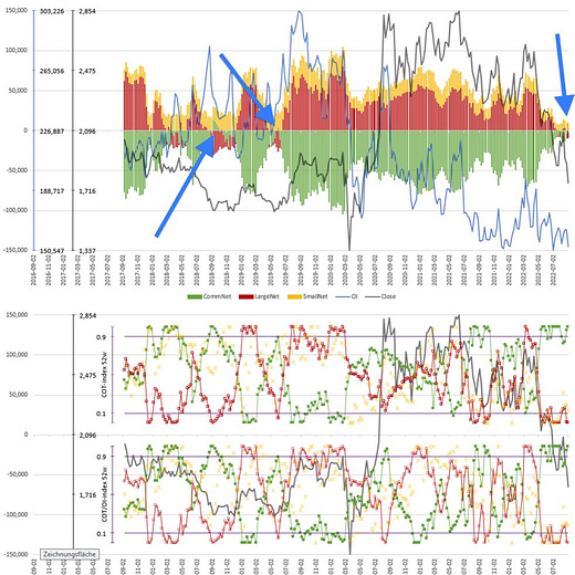 COT details for Bonds: This is the aggregated view for treasury futures. Commercials are at their highest net positioning in almost four years, Large Traders at their shortest level in about the same time.